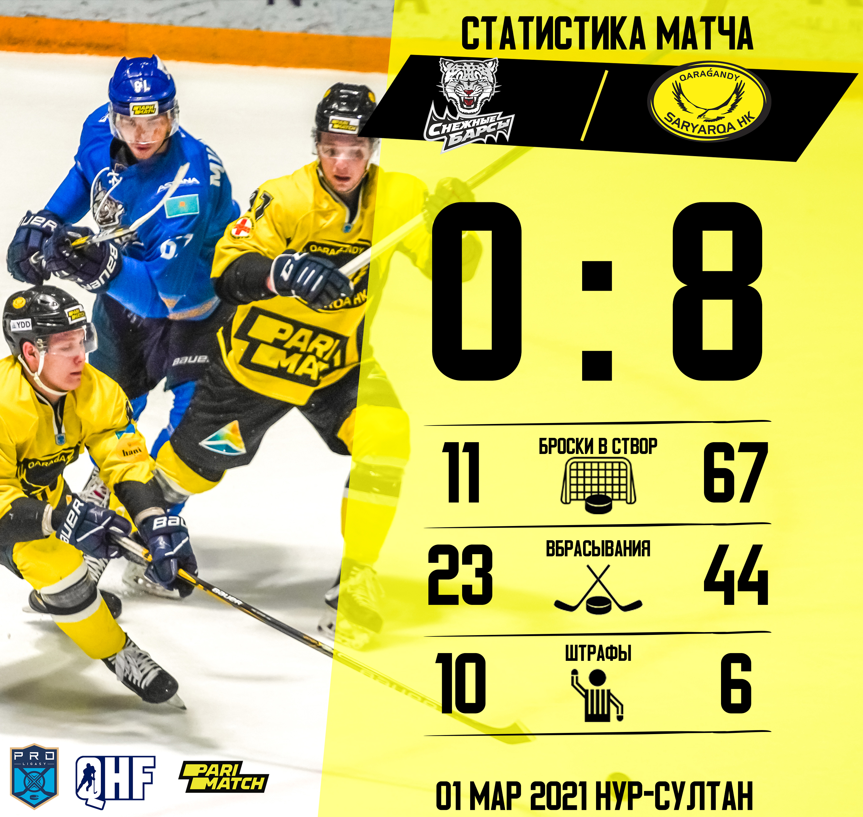 В первый день весны, «Снежные Барсы» принимали на своем льду «Сарыарку». Это был первый матч для Леонида Тамбиева в качестве главного тренера «Сарыарки» в этом зеное. Карагандинцы смогли уверенно обыграть соперников.