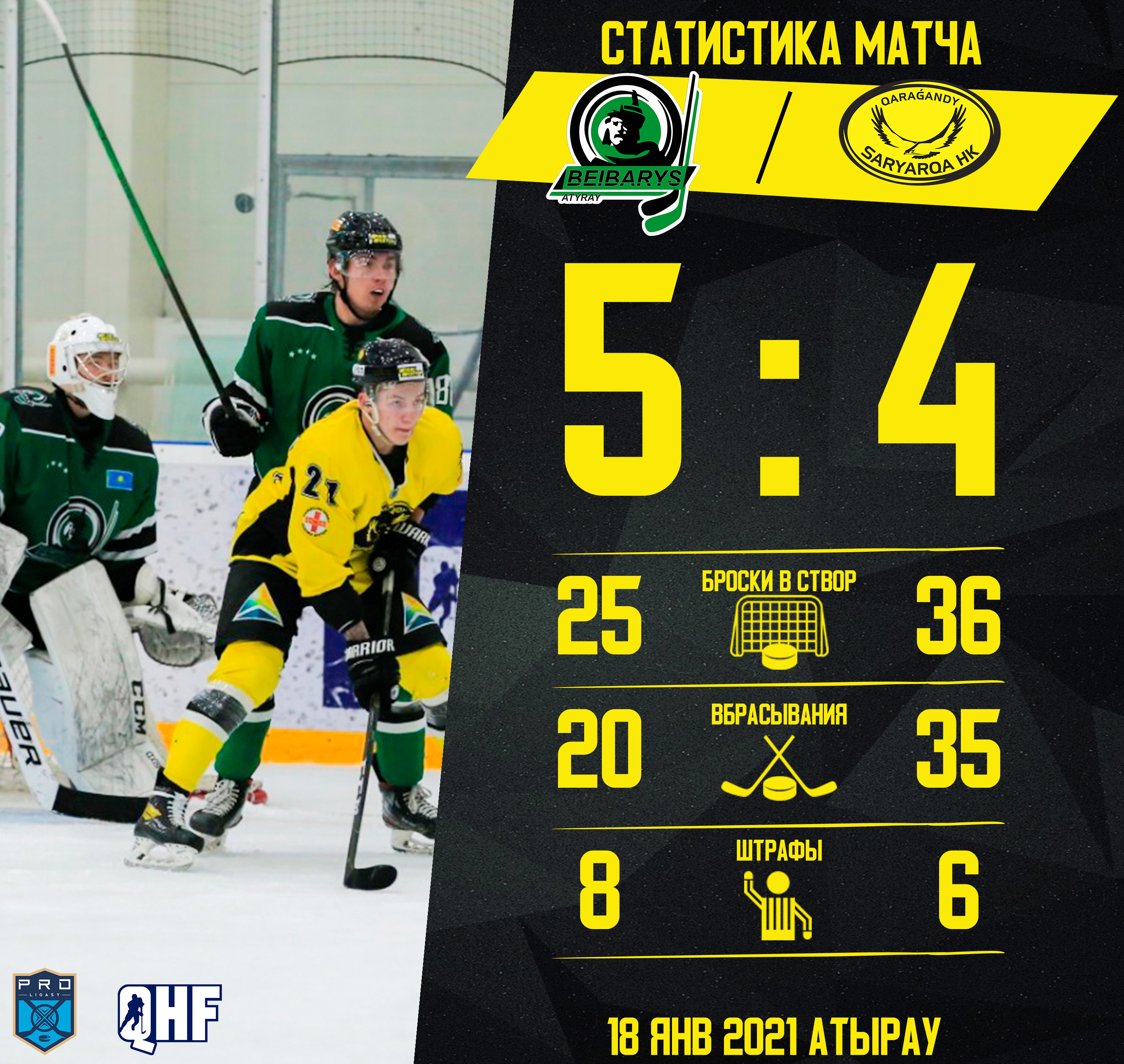 Хоккейный клуб «Сарыарка» провел первый гостевой матч 2021 года в городе Атырау. Подопечные Александра Соколова сыграли с командой «Бейбарыс». Матч между двумя командами получился очень зрелещным, и богатым на события. На 12 минуте «орлы» грамотно воспользовались численным большинством. После передачи Вадима Зеленкова и Никиты Анохина шайбу забросил Иван Безруков. Но, радость «желто-черных» не продлилась долго. Меньше минуты потребовалось хозяевам арены для того чтобы восстановить статус кво. Больше заброшенных шайб в первом периоде мы не увидели. И на первый перерыв команды ушли при счете 1:1.