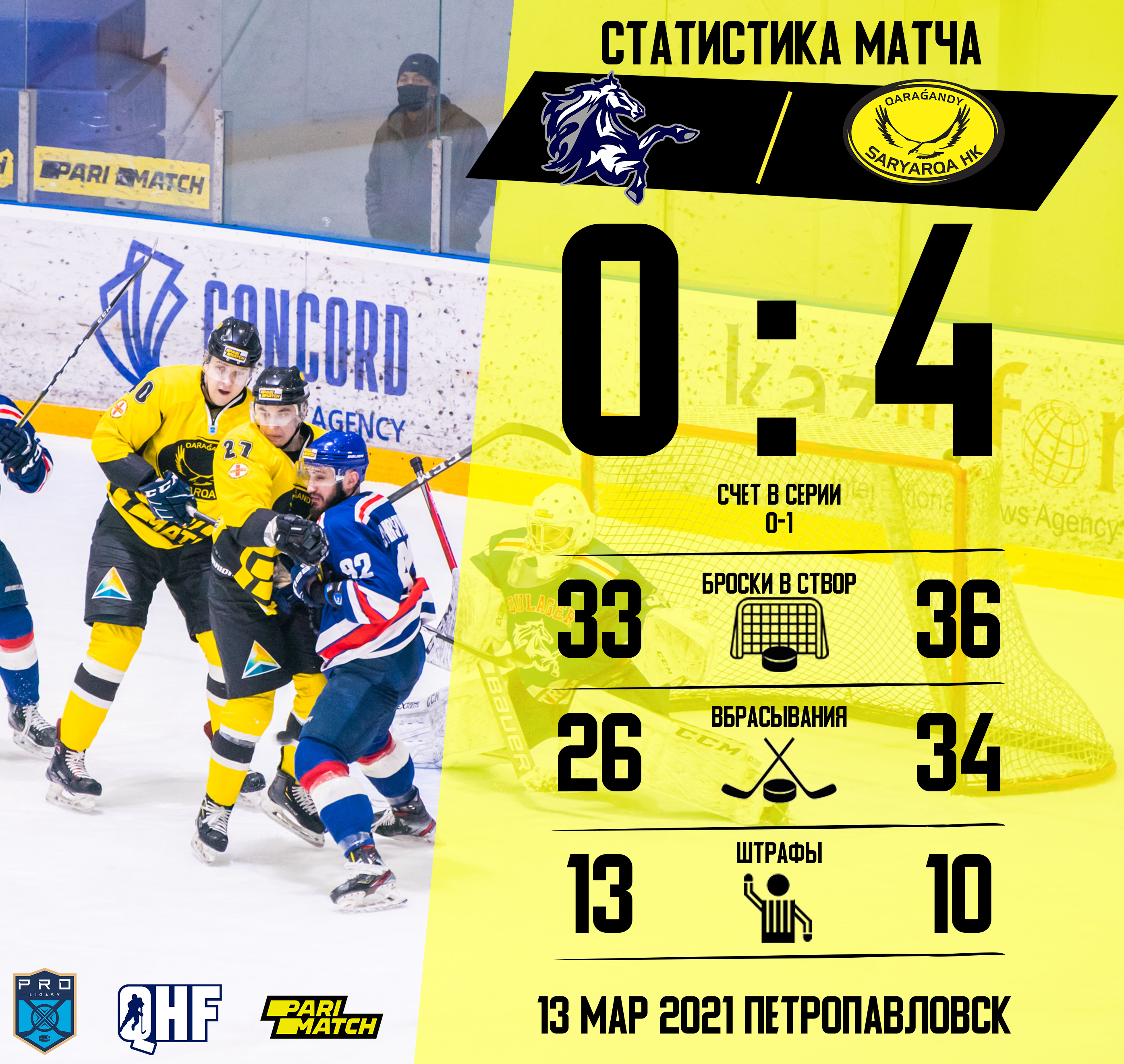 13 марта прошел первый матч серии плей-офф 1/4 финала PRO HOKEI LIGASY. Петропавловский «Кулагер» принимал на своем льду Карагандинскую «Сарыарку»