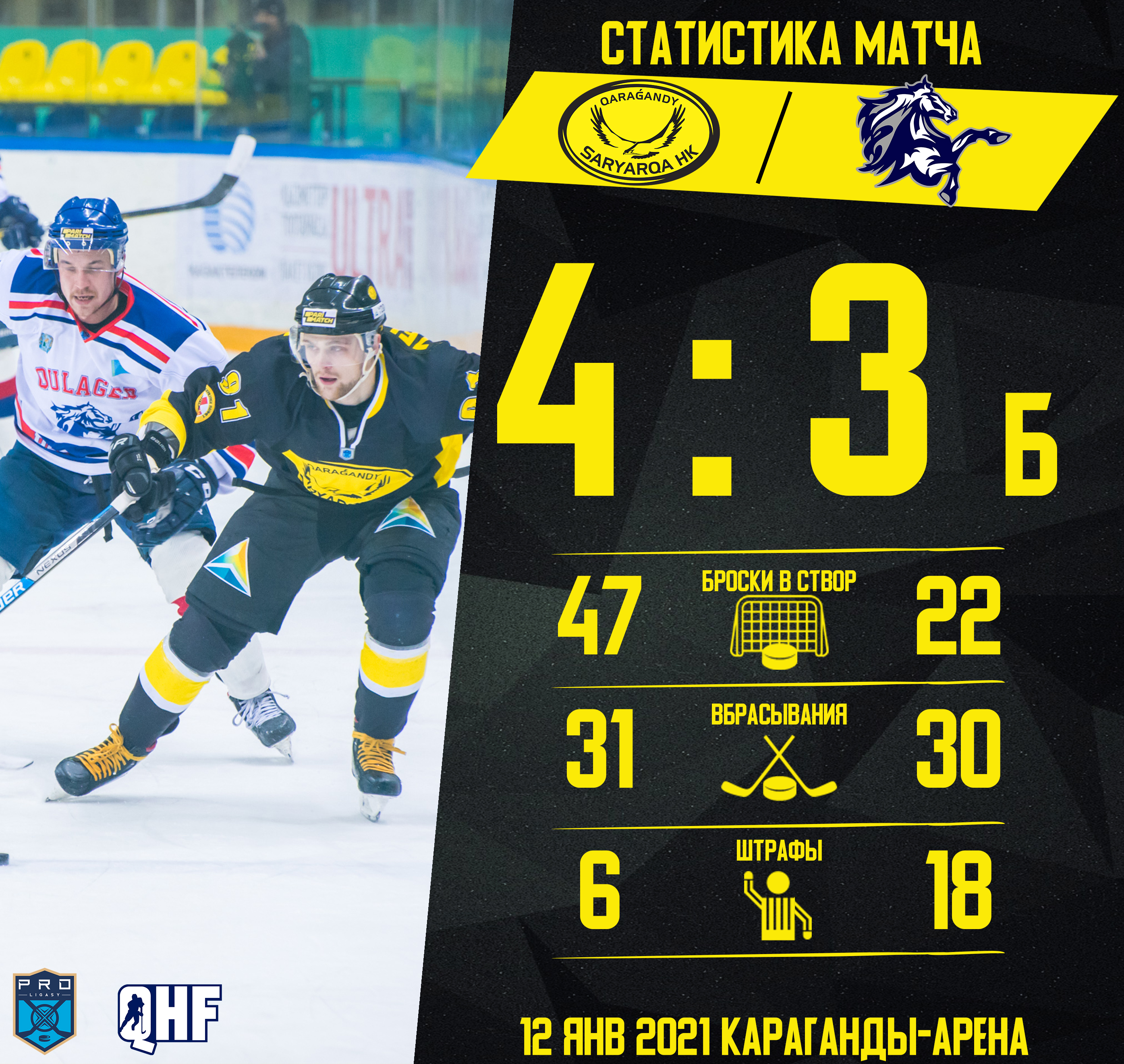 12 января в Караганде «Сарыарка» встретилась с Петропавловским «Кулагером». Игра началась с атак карагандинцев. На 12-й минуте Степан Грымзин с подачи Аноховского забросил первую шайбу в ворота гостей. На 18-й минуте кулагеровцам удалось сравнять счет. Евгений Попитич с передачи Первухина и Хорошева поразил ворота Никиты Бояркина.