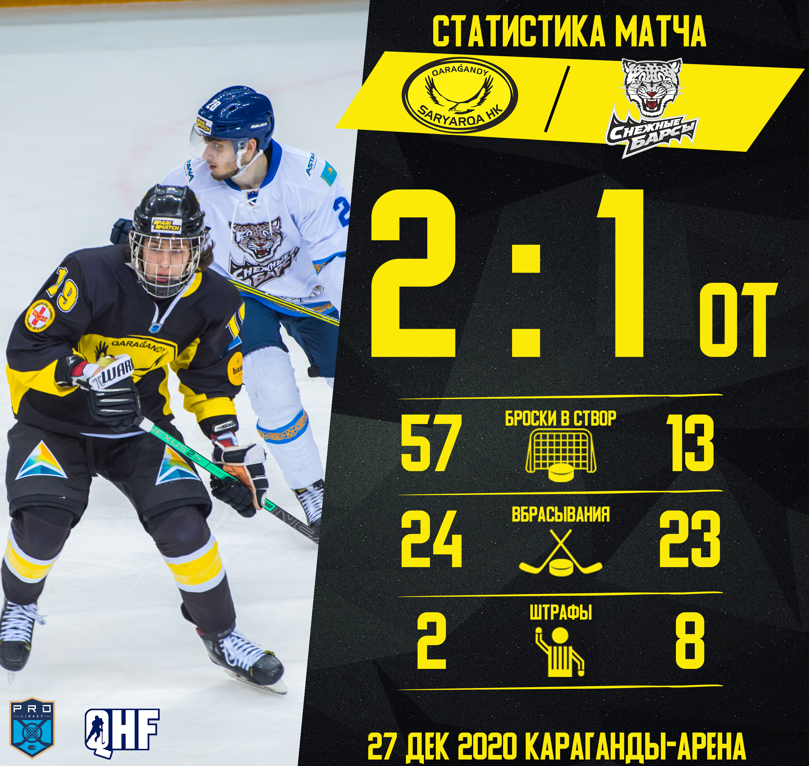 27 декабря состоялась первая игра в двухматчевом противостоянии в рамках чемпионата РК по хоккею с шайбой между клубами «Сарыарка» (г. Караганда) и «Снежные барсы» (г. Нур-Султан). На протяжении всей игры карагандинцы атаковали. Первый период прошел всухую.