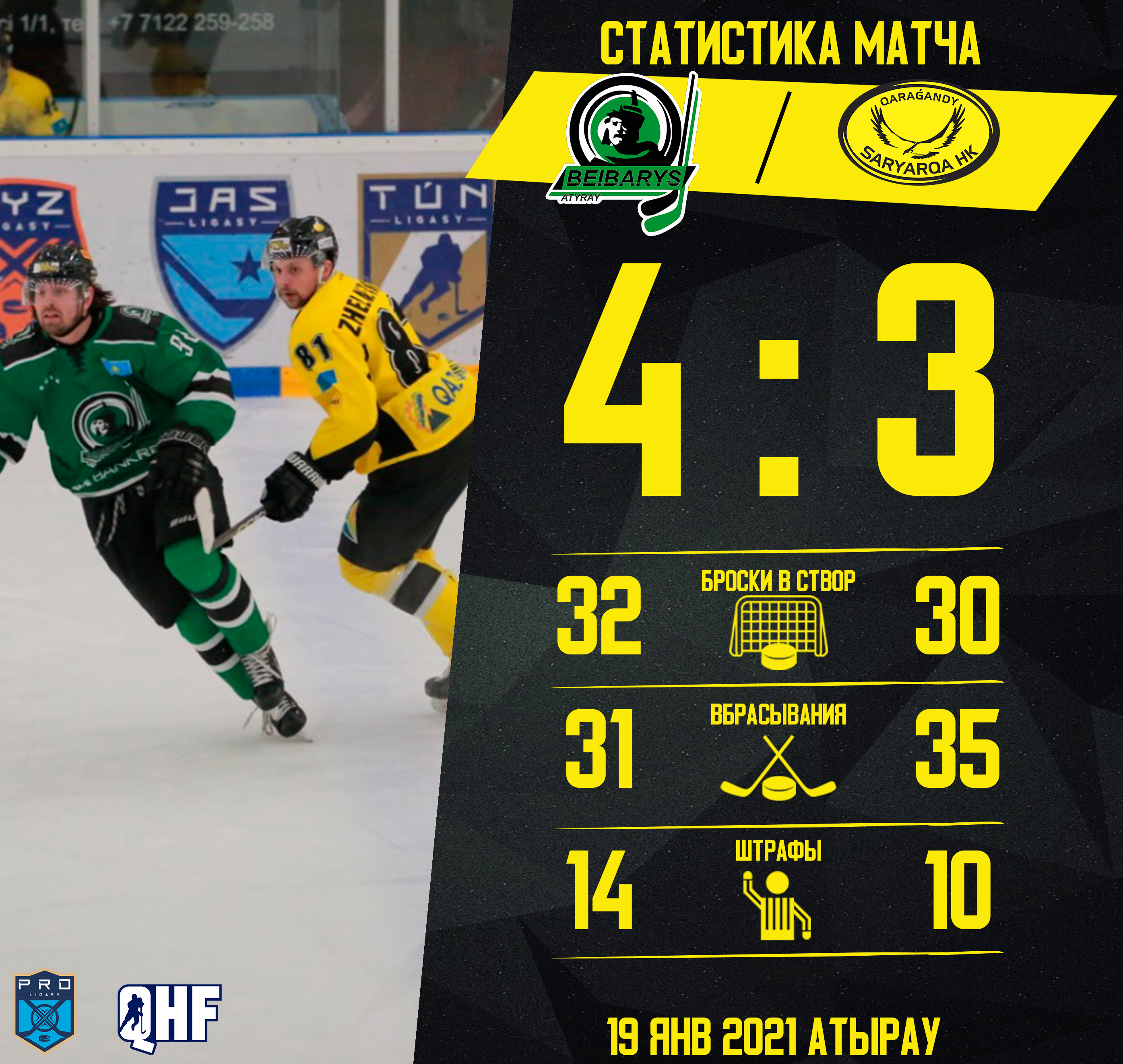 Счёт равный 3:3. Врываясь в зону карагандинцев хозяева льда провели быструю атаку, которая после оказалась результативной. После передачи Гарифулина и Закарлюкина, шайбу забросил Егор Кожевников, и вывел свою команду вперед. Счёт 4:3. Сарыарка взяв 30 секундный перерыв и после убрав вратаря, попыталась обыграть соперника используя численное приемущество, но увы безрезультатно. Второе поражение от команды Бейбарыс.