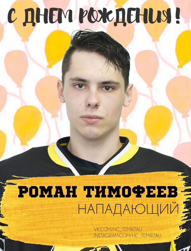 Сегодня, 10 сентября, свой день рождения празднует нападающий ХК "Темиртау" Роман Тимофеев. Желаем быть здоровым, счастья и множество улыбок! Успехов в карьере и достижения новых высот! С Днем рождения!