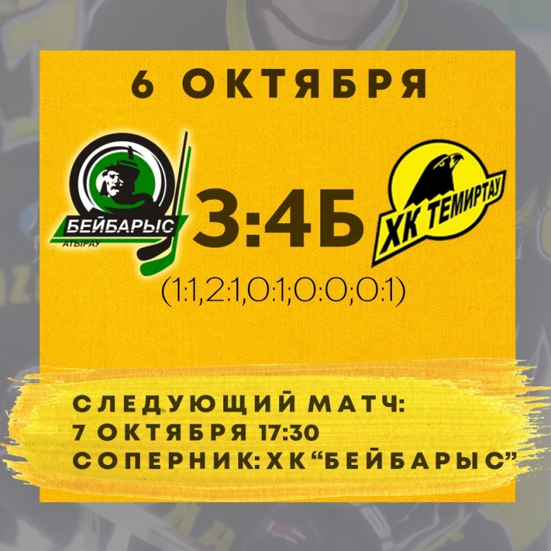 В первом матче против атырауской команды темиртаусцы одержали победу. Игра шла на равных. Первым счет в матче открыл игрок "Бейбарыса" Дмитрий Степанов, спустя несколько минут Вадим Зеленков из "Темиртау" сравнял счет. Во втором периоде Никита Незнамов увеличил преимущество в одну шайбу, но хозяева льда забили еще две ответные шайбы. На второй перерыв команды ушли со счетом 3:2. За минуту до конца третьего периода "Темиртау" сравняла счет. Автором шайбы стал Андрей Мещеряков. В овертайме, несмотря на обилие опасных моментов у ворот "Бейбарыса", шайбу забросить не удалось. А в серии послематчевых буллитов удачливее были хоккеисты «Темиртау». Лишь одну шайбу пропустил Богдан Белоконский.