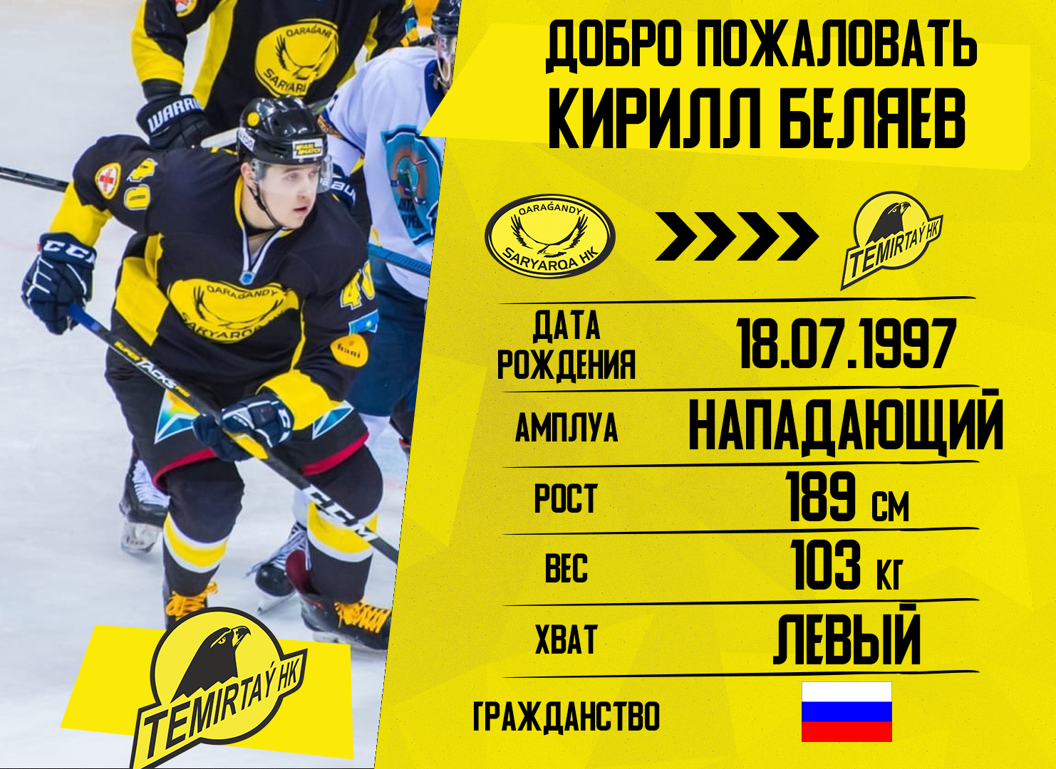 Нападающий Кирилл Беляев стал игроком ХК "Темиртау".