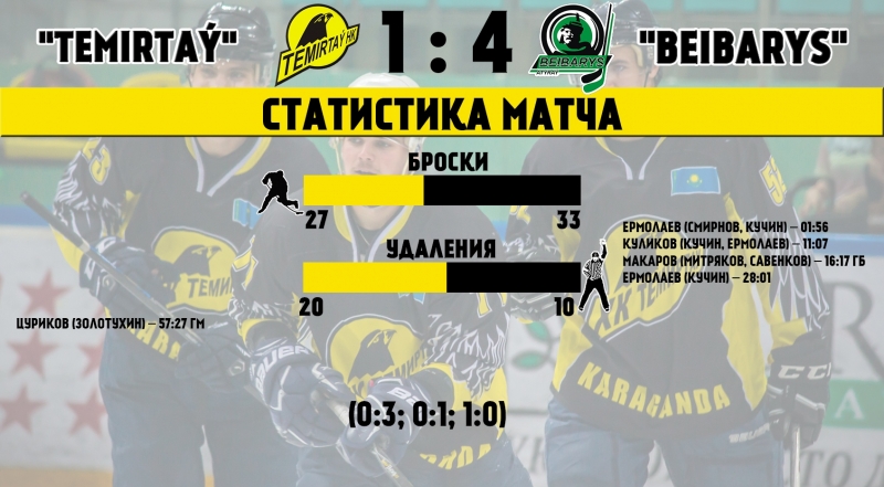 Лишь под занавес заключительной трети матча хоккеистам из Темиртау удалось «размочить» счет и не позволить сопернику завершить игру с нулем на табло. Воспользовавшись ошибкой вратаря соперника, Владиславу Цурикову удалось забросить шайбу в численном меньшинстве. Итог поединка – 1:4 в пользу ХК «Бейбарыс»