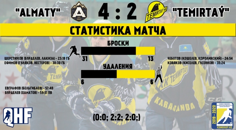 В заключительной трети игры сильнее оказались хоккеисты из "Алматы". Вперёд алматинцы вышли за две минуты до окончания матча. Тренерский штаб "Темритау" решил заменить вратаря на шестого полевого игрока, но это привело лишь к четвертой пропущенной шайбе, 4:2, темиртаусцы потерпели поражение.