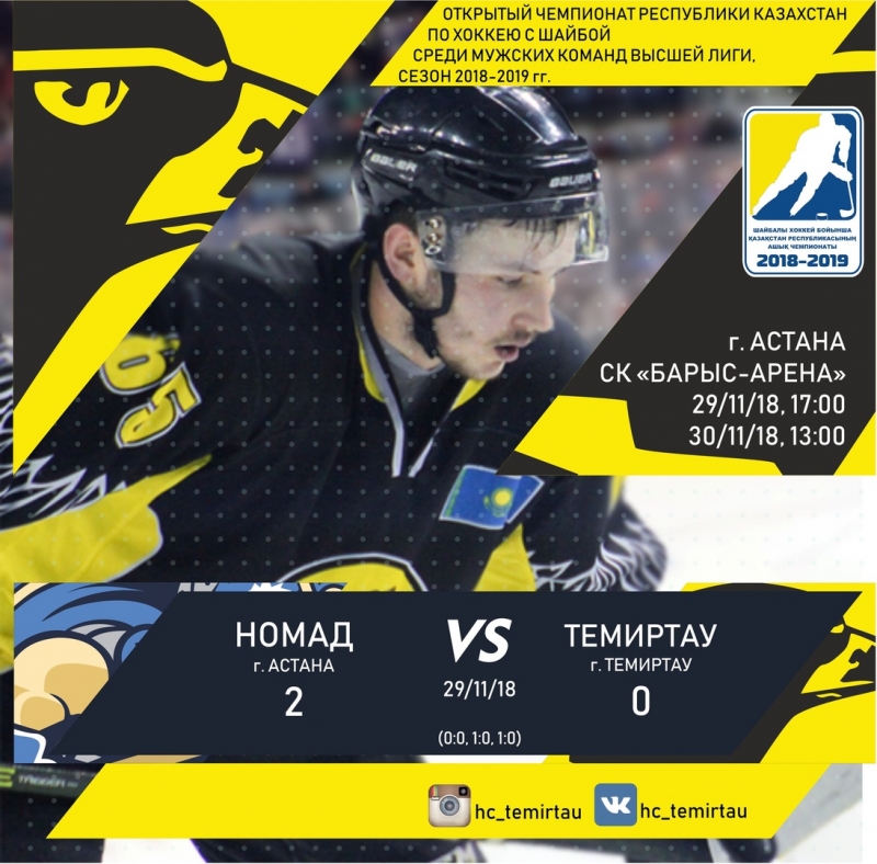 ХК "Номад" – ХК "Темиртау" 2:0 (0:0; 1:0; 1:0);
