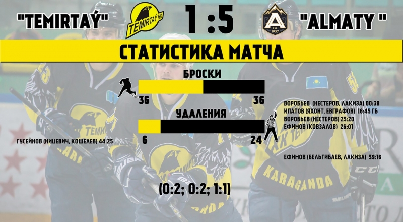 В заключительной трети матча команды обменялись шайбами в ворота друг друга. Автором единственной шайбы в составе «Темиртау» стал Муса Гусейнов. Итог поединка 1:5 в пользу ХК «Алматы».