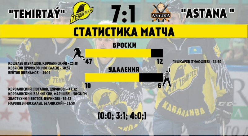 Самой результативной для «Темиртау» стала заключительная треть матча. Сначала капитан команды «Темиртау» Евгений Королинский оформил дубль в ворота Вячеслава Нечвиенко. Затем Иван Золотухин забросил шестую шайбу. Точку в матче поставил Данила Марушев, забросив седьмую шайбу. Итог - 7:1 – уверенная победа «Темиртау»! Евгения Королинского с дублем!
