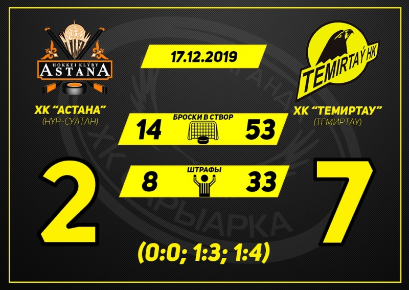 "Астана" (г. Нур-Султан) - "Темиртау" (г. Темиртау) - 2:7 (0:0; 1:3; 1:4).