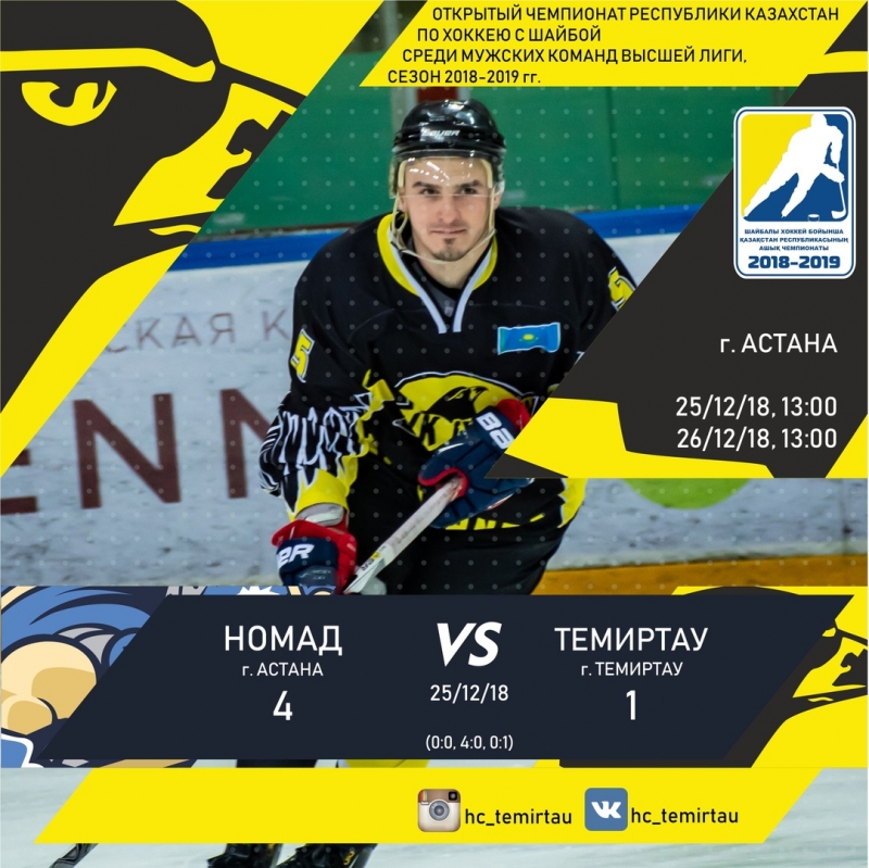 ХК «Номад» - ХК «Темиртау» 4:1 (0:0; 4:0; 0:1);
