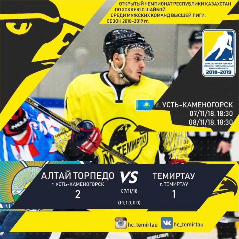 В первой встрече команде "Темиртау" не удалось обыграть ХК "Алтай Торпедо". На 8 минуте матча счет открыл игрок усть-каменогорской команды - Александр Меньщиков. Через 5 минут темиртаусцам удалось сравнять счет. Автором шайбы стал Вадим Зеленков. Во втором отрезке матча "Алтай Торпедо" забросила еще одну, решающую исход матча шайбу, в ворота Богдана Белоконского.