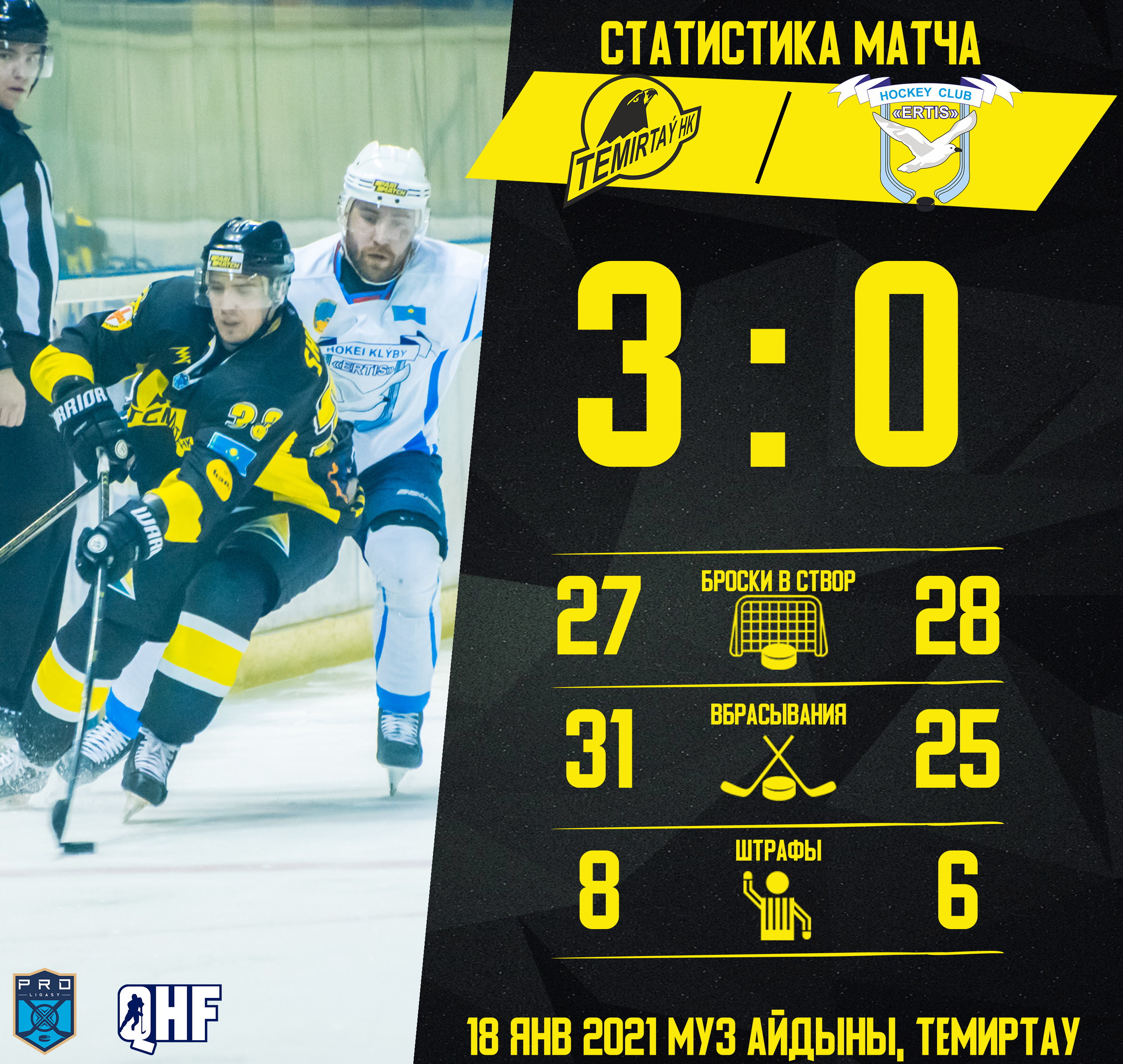 Хоккейный клуб клуб «Темиртау» провел очередной домашний матч в рамках Чемпионата Казахстана Pro Hokei Ligasy. В городе металлургов подопечные Романа Козлова принимали павлодарский «Ertis», который идет на предпоследнем месте турнирной таблицы. В целом первый период матча прошел в обоюдно острых атаках. Но забить игрокам не удалось. Как итог, на первый перерыв команды ушли при счете 0:0