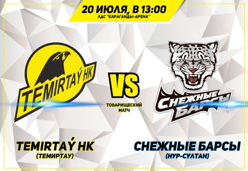 Уважаемые болельщики! 20-го июля на льду ЛДС «Караганды-Арена» состоится товарищеский матч между командами ХК «Темиртау» и ХК «Снежные Барсы». Начало матча в 13:00 по времени города Нур-Султан. Вход свободный! Приходи поддержать любимую команду!