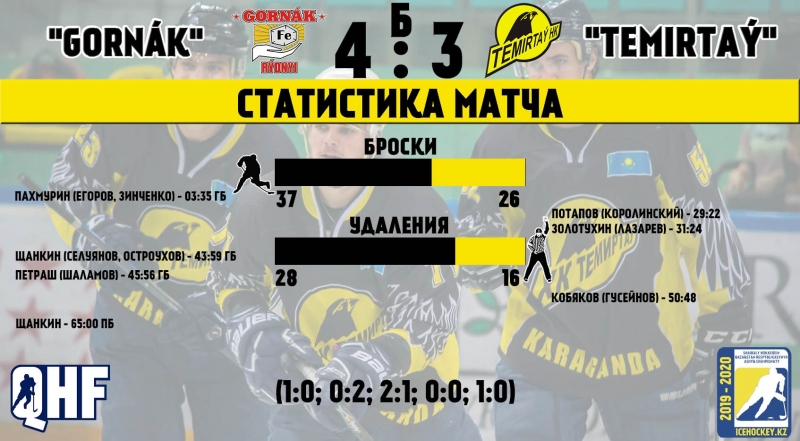 В третьем отрезке матча хозяева площадки забросили две быстрые шайбы. Счёт на табло 3:2. До завершения этого периода нападающий ХК «Темиртау» Евгений Кобяков сравнял счёт. Основное время матча завершилось в ничью. В дополнительной пятиминутке выявить победителя команды не смогли. В серии буллитов хоккеисты «Горняка» оказались сильнее.