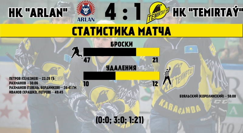 В третьей двадцатиминутке команды обменялись шайбами. Среди подопечных Евгения Королева единственной шайбой отличился Андрей Буяльский. Счет матча – 4:1 в пользу ХК «Арлан».